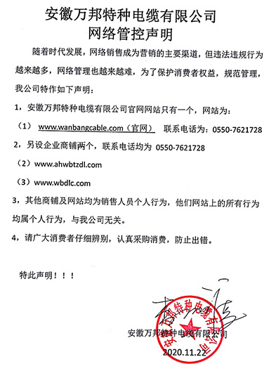 鄭重聲明:安徽萬邦特種電纜有限公司官方網站為:www_wanbangcable_com.rtjiaju.cn,除此之外無任何子網站或合作網站,其余均為假冒偽劣。電話:0550-7621728 13485756353 地 址:安徽省天長市滁州高新技術產業開發區經四路29號